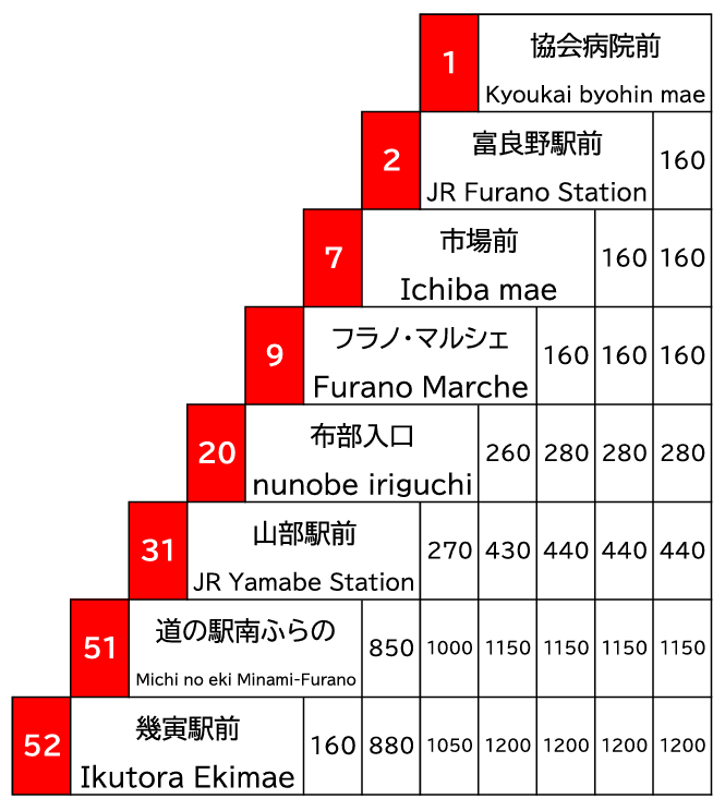 | 富良野駅前 | 6:50 | 7:50 | 9:25 | 10:50 | 11:47 | 12:40 | 13:40 | 16:15 |